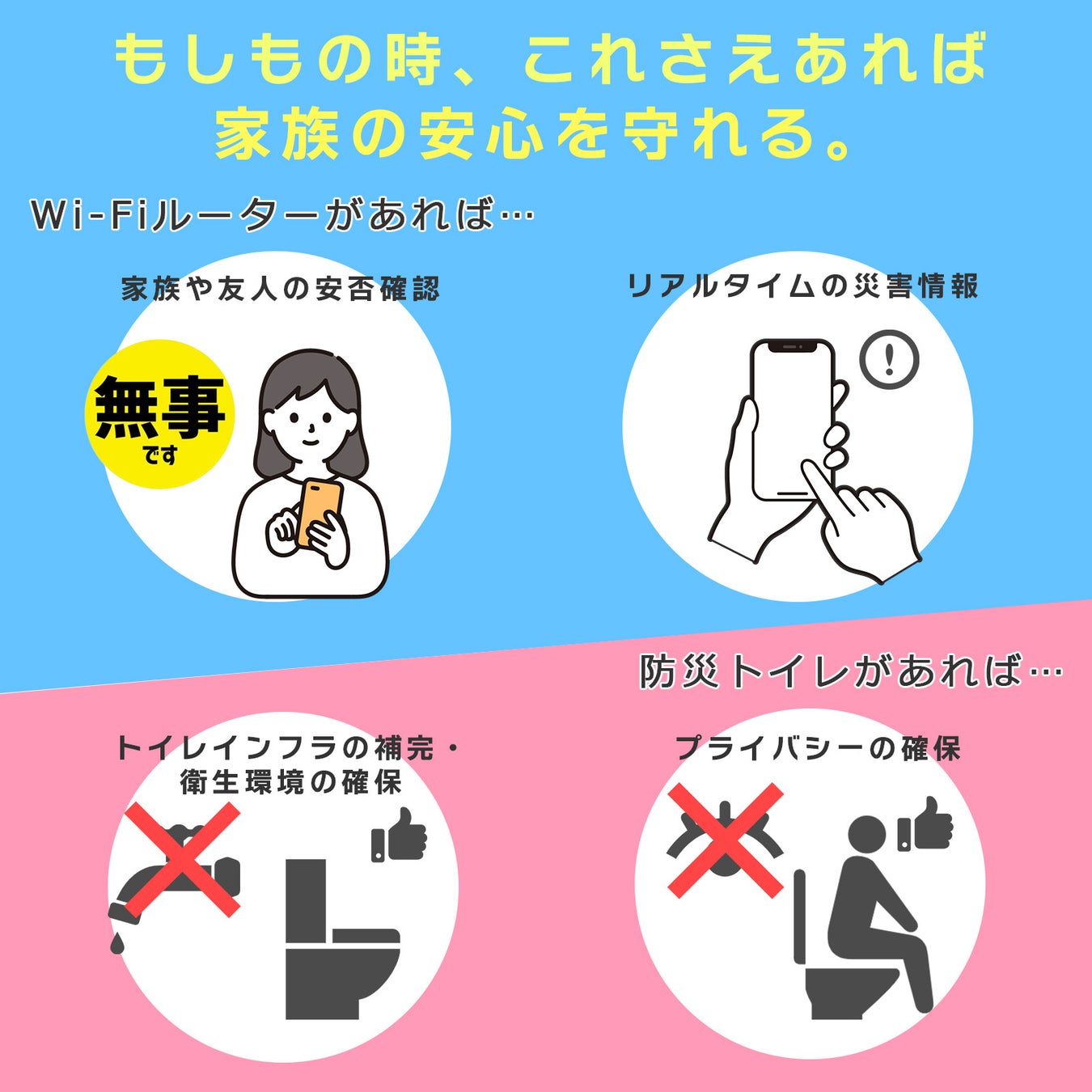 災害時のトイレ確保や家族との連絡、情報収集をサポート。排便袋、防臭袋、目隠しポンチョ付き防災トイレと、契約不要で使える備蓄型Wi-Fiで安心を提供