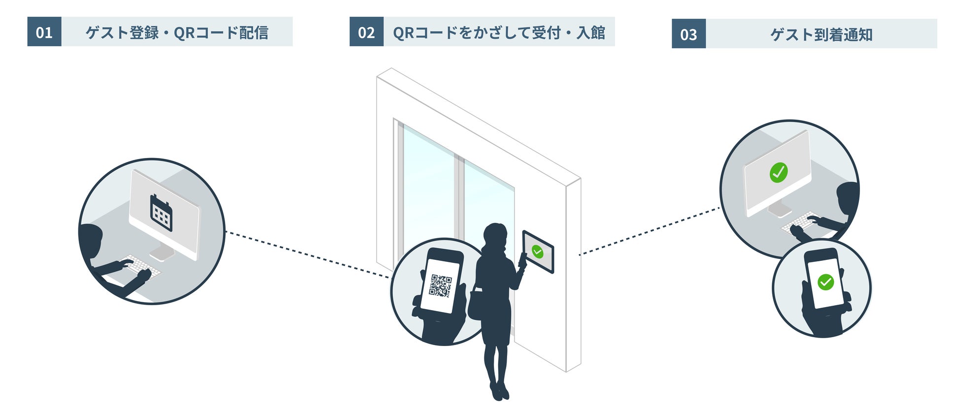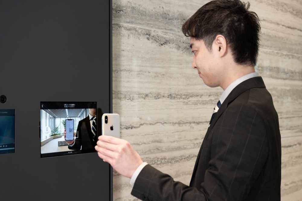 当ビルは、1階エントランスに来訪者受付用のタブレット端末を設置しました。テナント企業の担当者が予め来訪者にQRコードを送付することで、来訪者は当日、端末にQRコードをかざすだけで受付が完了するほか、エントランスドア横の認証用端末にQRコードをかざすだけで、そのままセキュリティを解錠し、訪問先のフロアに向かうことができます。