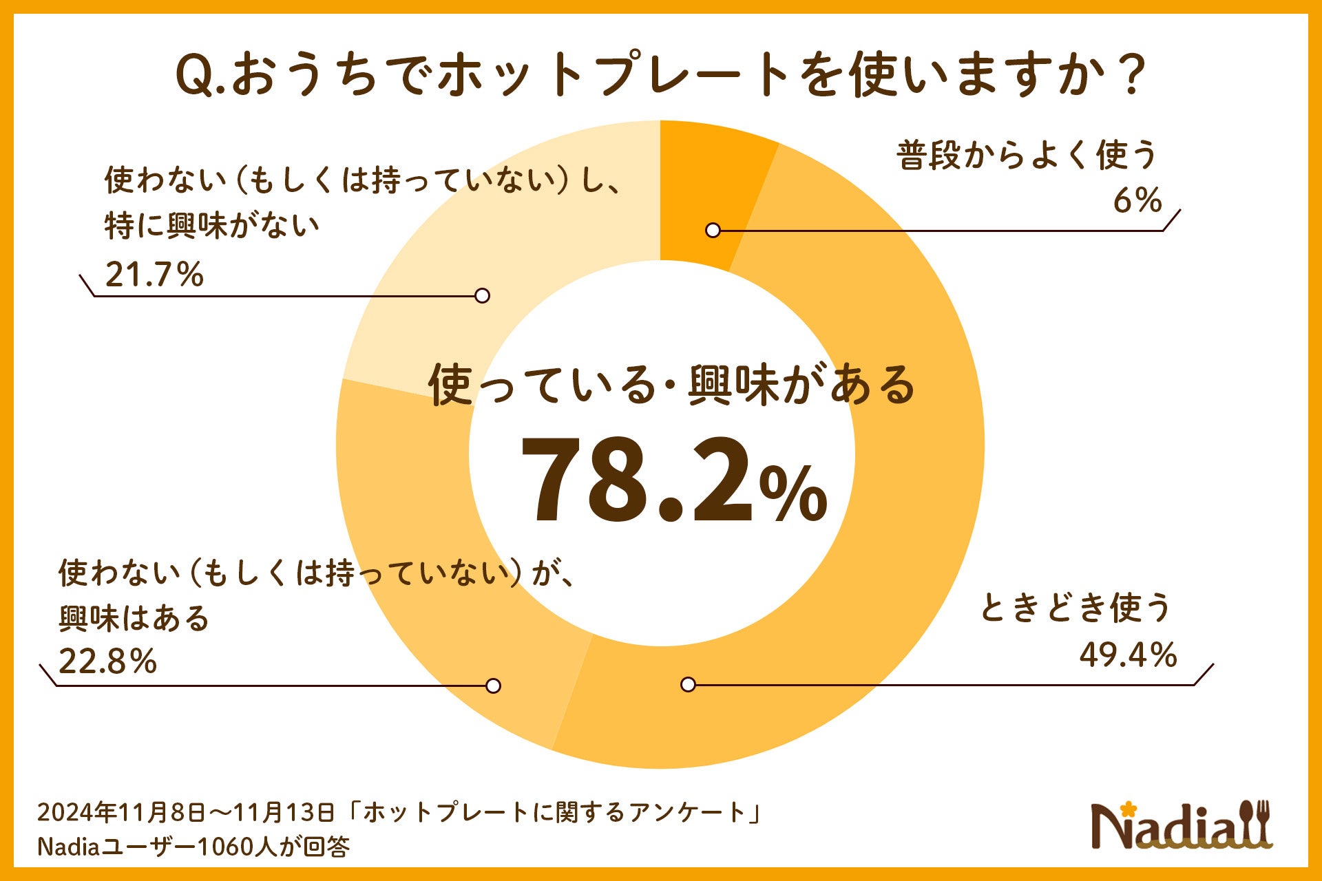 みんなで楽しく料理を作れるホットプレートは、イベント感もあって子どもも大好き。また、ご飯作りに追われる夕飯のお助けアイテムでもあります。「ホットプレートに関するアンケート」調査(※1)によると、「おうちでホットプレートを使うか」という質問で「普段からよく使う」と答えた人は6%、「ときどき使う」は49.5%、「使わない(もしくは持っていない)が、興味はある」は22.8%で、ホットプレートを使っている・興味がある人は78.2%という結果になりました。ただし、多くの人がホットプレートを持っている一方、約半数の方は頻繁には使用していないということがわかりました。