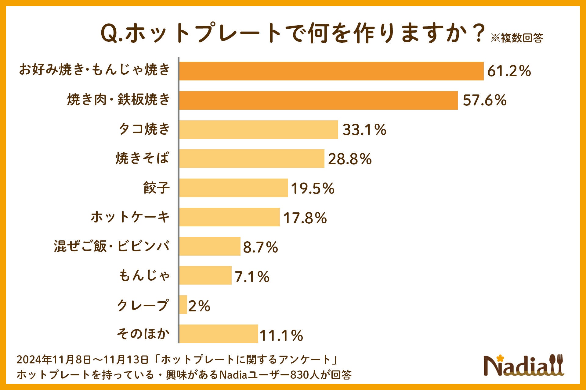 また、「ホットプレートで何を作るか」という質問では、「お好み焼き・もんじゃ焼き」「焼き肉・鉄板焼き」が上位に。そのほかに作るメニューでは、「パエリア」「チーズフォンデュ」「チーズタッカルビ」「瓦そば」「鍋」「すき焼き」などといった声が挙がりました。