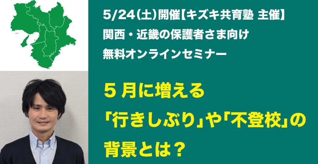 GW明け不登校のお悩みを一挙解決!関西地域に特化した不登校からの進学事情も大公開。主催は不登校のお子さん向けの個別指導塾・キズキ共育塾。参加無料のオンラインセミナー。