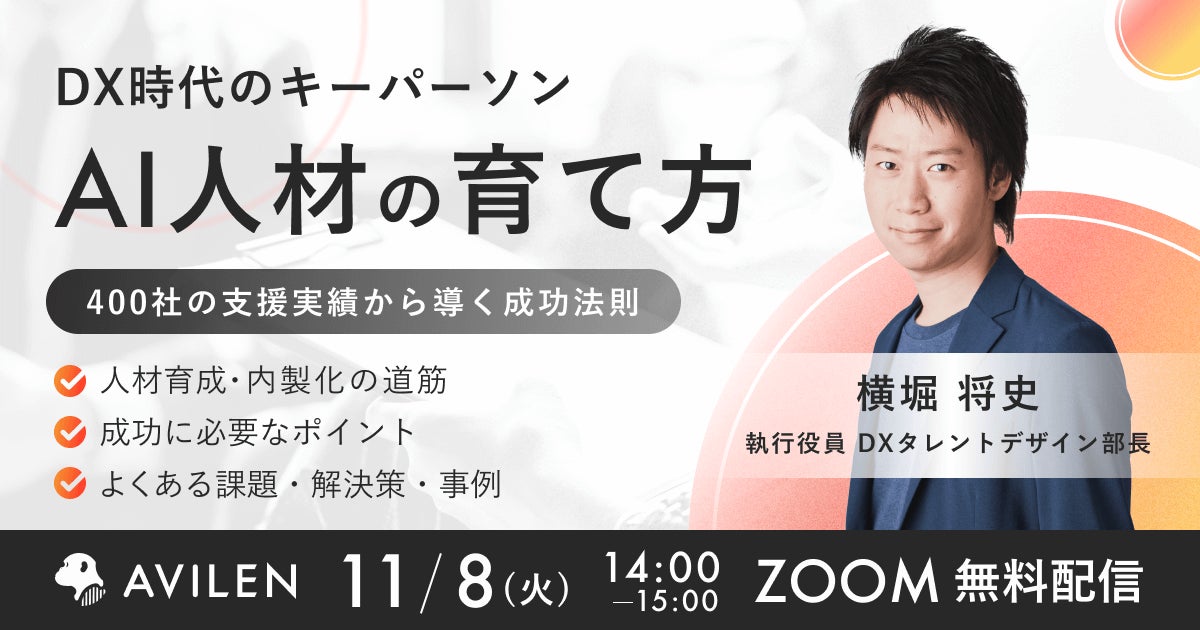 株式会社AVILEN(東京都中央区、代表取締役:高橋 光太郎、以下「AVILEN」)は、2022年11月8日(火)14時から、オンラインセミナー『DX時代のキーパーソン AI人材の育て方』を開催します。