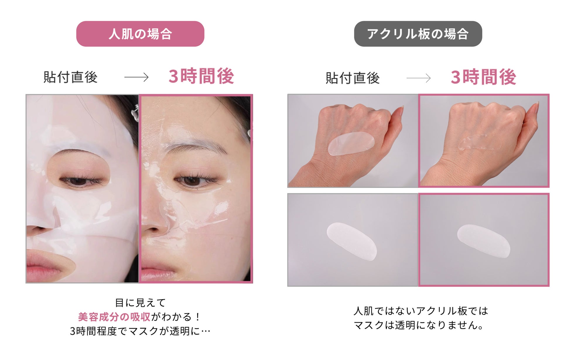 肌の温度に反応して、時間の経過とともにシートが乳白色から透明に変化。ご使用中の変化をお楽しみいただける、新感覚のマスクです。