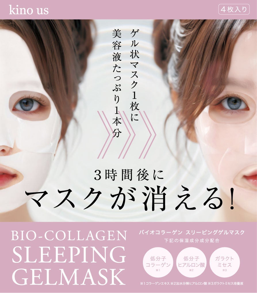 【kino us】3時間後にマスクが消える!機能性特化のブランド『キノアス』から、美容液たっぷり1本分を固めた保湿ゲル状マスク「バイオコラーゲン スリーピングマスク」登場