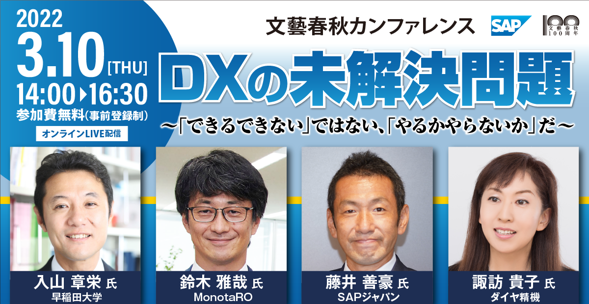 株式会社文藝春秋(本社:東京都千代田区 代表取締役社長:中部嘉人)は3月10日(木)、「DXの未解決問題」をテーマにカンファレンスを開催します。本カンファレンスでは、変革へと動き出す中堅・中小企業のリーダーの皆様にご登壇をいただき、DXを進めるうえでの未解決問題について「対話」「構想力」「推進力」「突破力」「展開力」「変革の定着」「行動変容」などの視点から実践的な内容をお届けします。