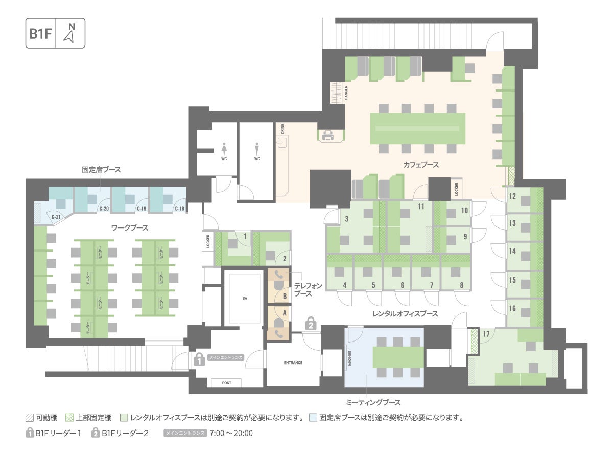 設備:Wi-Fi、フリードリンク、無料プリンター、ロッカー、ポスト、登記可、会議室、WEB会議用個室