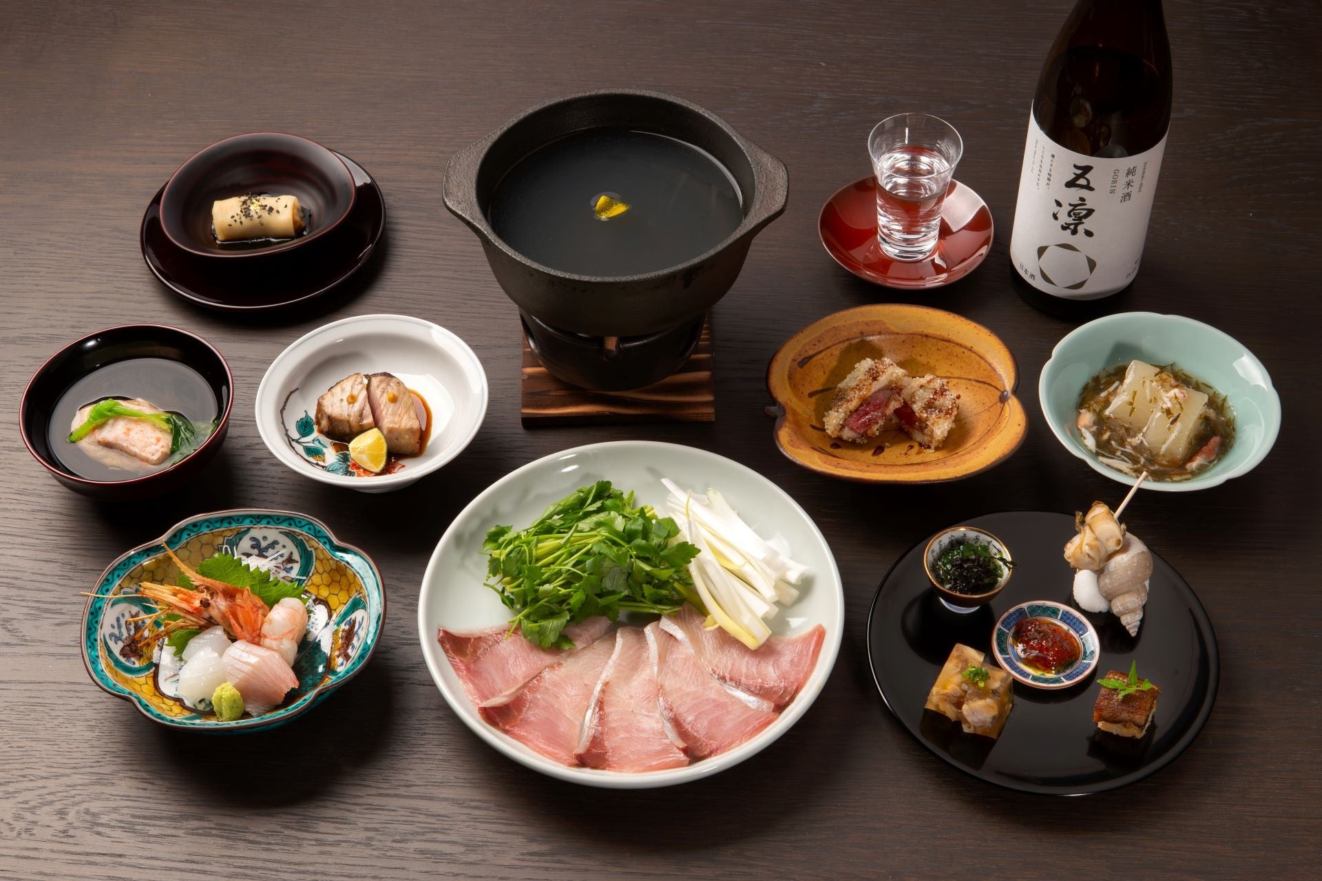 先付けには香りを楽しむ藁焼きのたたき、お造りにももちろん鰤を。メインは口の中でとろけるような旨味を引き立てる「能登鰤のしゃぶしゃぶ」を、おろしポン酢とごまだれの2種の味わいでお楽しみいただけます。付け合わせには、加賀野菜の金沢セリや金沢一本太ねぎをご一緒に。