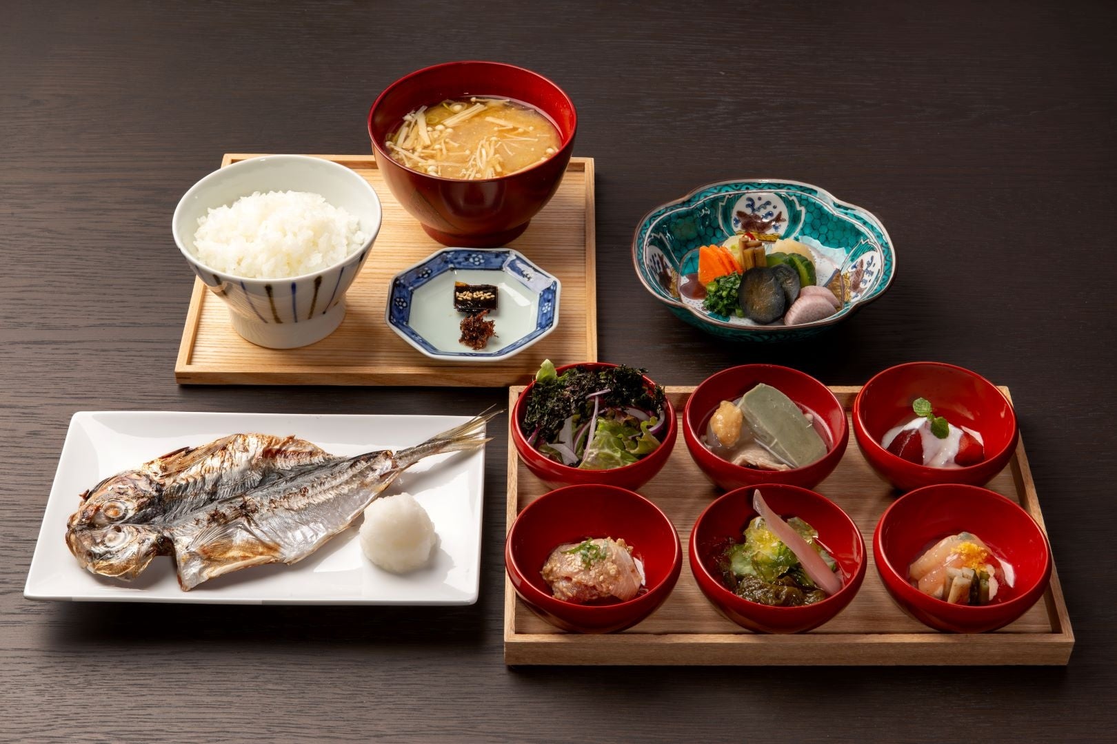 自家製干物 / 鶏もも肉味噌漬け焼き / だし巻き玉子 / 信州産ソーセージと地卵の目玉焼き