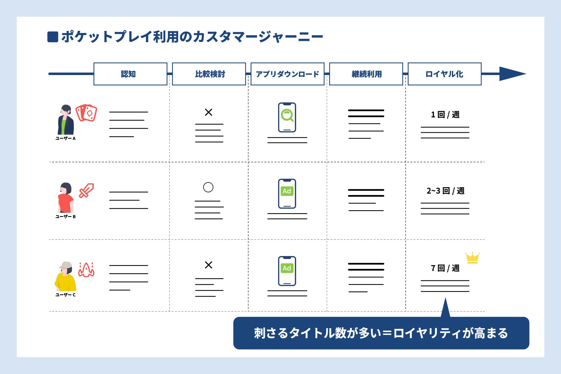 また、今回は定性調査の結果をカスタマージャーニーマップの形で納品させていただきました。「ポケットプレイ」の課題に合わせて単にユーザーの行動を追うだけでなく、ポケットプレイを長期的に利用してファン・ロイヤルユーザーへと成長していく過程の可視化ができました。その結果、ユーザー像が整理され、より効果的なマーケティング施策に落とし込むことができています。