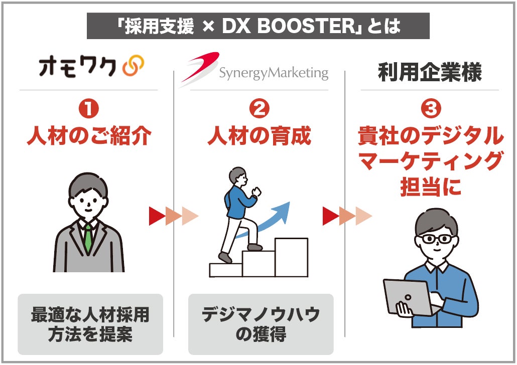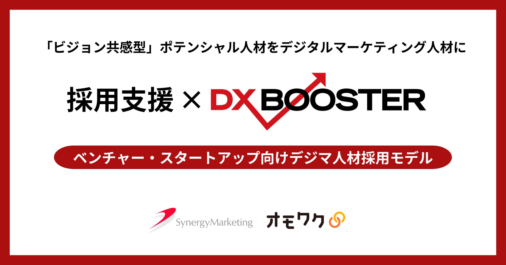 シナジーマーケティング株式会社(所在地:大阪市北区、代表:奥平 博史、以下当社)は、デジタルマーケティング自走支援サービス「DX BOOSTER(読み方:ディーエックスブースター)」と、株式会社オモワク(所在地:大阪市北区、代表:高山 敦司、以下オモワク)が提供する事業フェーズに適した人材マッチングサービスを組み合わせた新サービス「採用支援×DX BOOSTER」を開始しました。本サービスでは、デジタルマーケティング専門スタッフが、企業のビジョンや事業に共感し将来の成長に貢献できるポテンシャル人材の提案と採用を支援し、社内で自走できるデジタルマーケティング人材に育成することを目指しています。特に、デジタル人材の高騰化や供給不足に悩むスタートアップや中小企業に最適なサービスです。