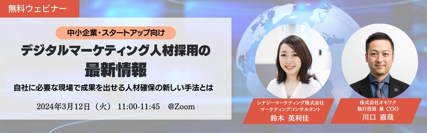 本ウェビナーでは、社内でデジタルマーケティング人材を育成してきた当社とデジタルマーケティング人材の紹介を進めているオモワクで実際にご支援した企業の事例を基に、今スタートアップや中小企業がどのようにしてデジタルマーケティング人材を確保し、長期就業に繋げているのか、最新の手法をお話しします。デジタルマーケティング人材の採用でお悩みのご担当者様、ぜひ本ウェビナーでの最新情報をご参考にしてください。