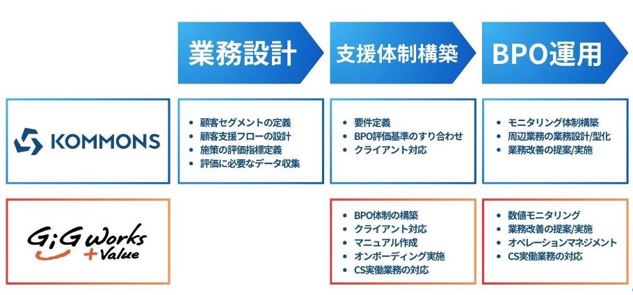 KOMMONSカンパニーがCS部門立ち上げに必要な業務設計・KPI設計・モニタリング体制構築などの要件整理を担当し、その設計に基づいてギグワークスアドバリューがBPO体制の構築および運用を実施します。両社の強みを活かすことで、迅速かつ柔軟なCS体制の構築・拡張を実現します。