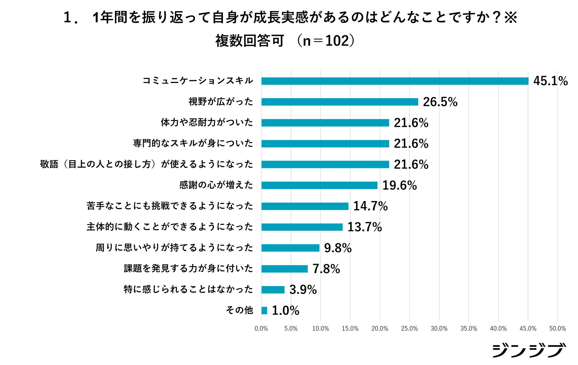 1.1年間を振り返って自身の成長実感があるのはどんなことですか?※複数回答可 (n=102)