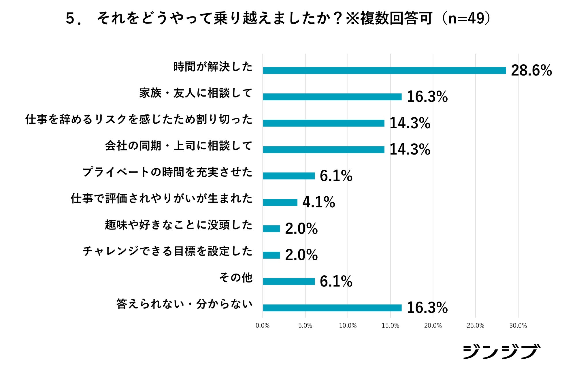設問3で「仕事を辞めたいと感じたことがあった」と回答した方に、どうやって乗り越えたか質問したところ、「家族・友達に相談して」(16.3%)、「会社の同期・上司に相談して」(14.3%)と身近な人への相談をするという回答が3割ある一方で、「時間が解決した」(28.6%)や「仕事を辞めるリスクを感じたため割り切った」(14.3%)と、4割以上の方が自身で割り切っていることが分かります。