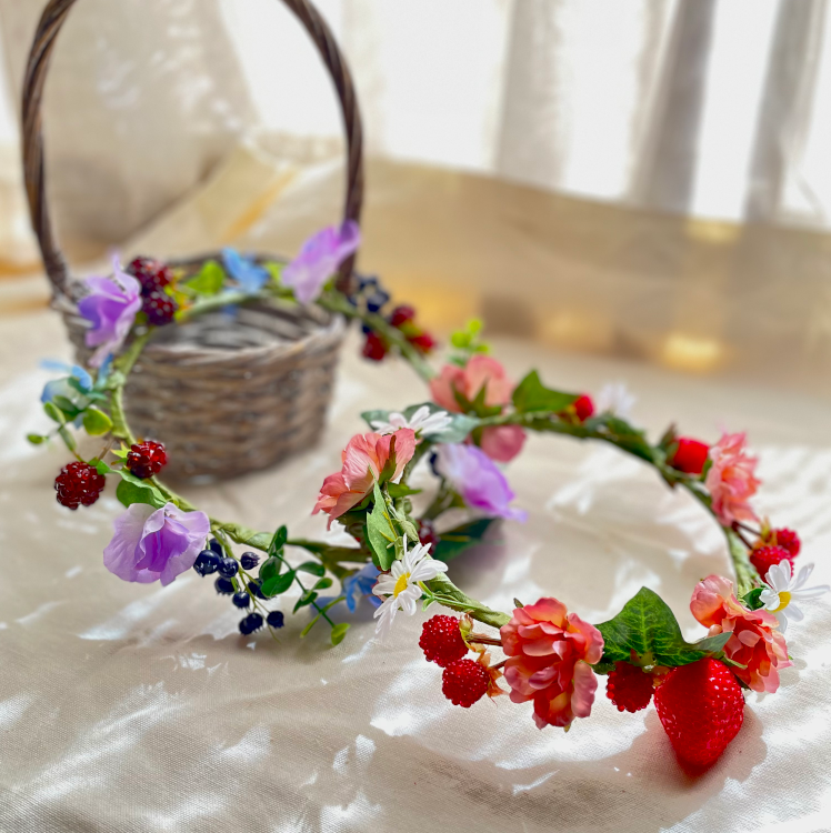 いちごの入った花かんむりをつくるワークショップ。ピンク系と紫系の2色から好きな色を選び、いちごやブルーベリーの入った花かんむりを作ります。春の訪れを旬のいちごとともに感じてみませんか。