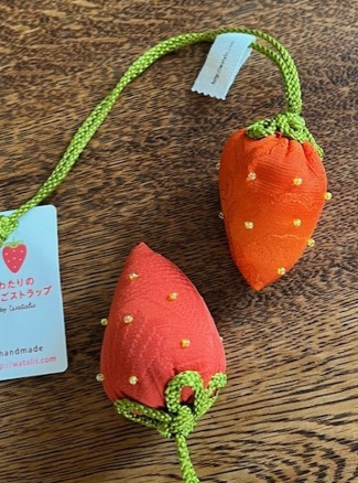 ディティールまで丁寧につくられたWATALISの宮城県亘理町「いちごのストラップ」。着物地なので一つひとつ違う表情を持つ人気商品です。