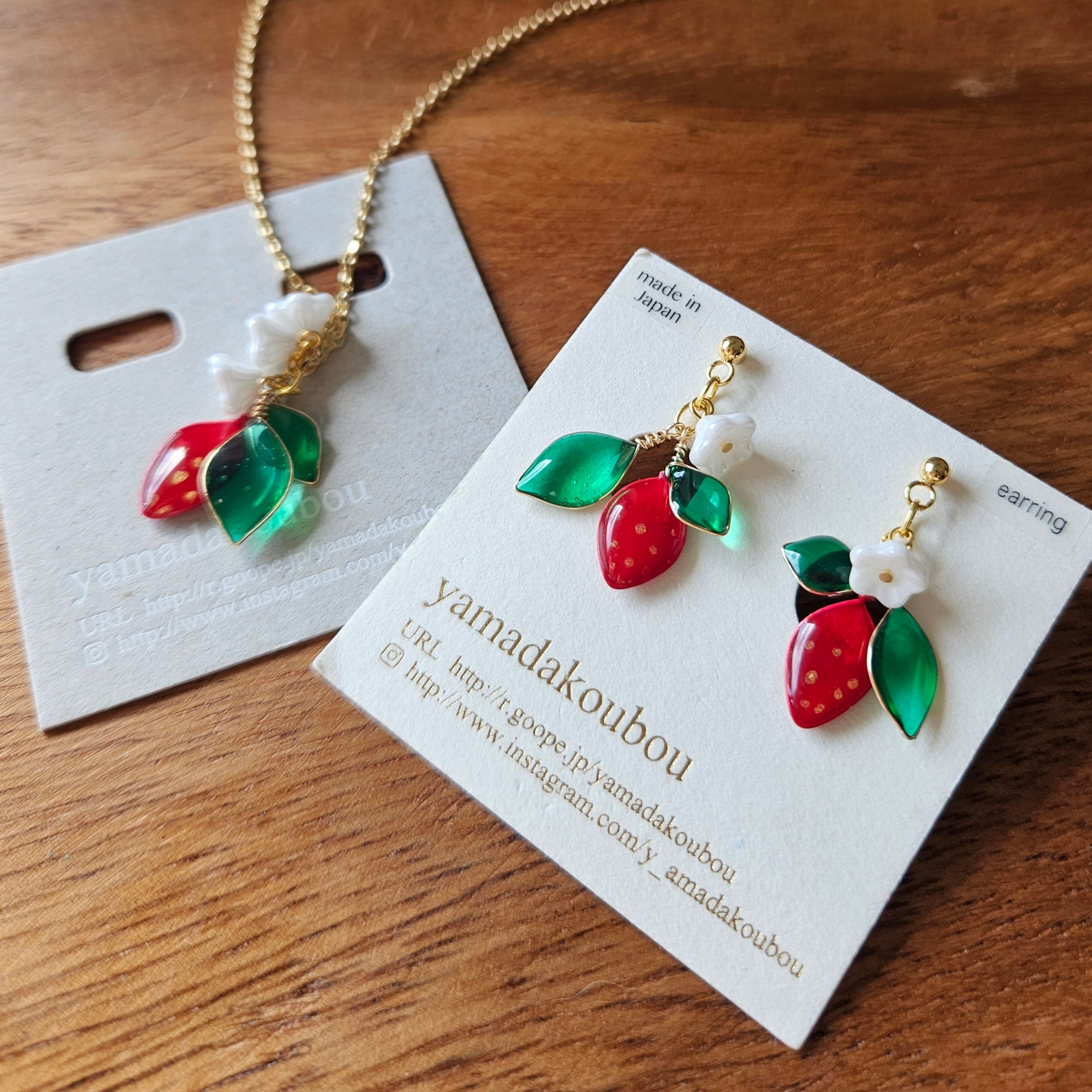 ワイヤーで一つ一つ手作りしたいちごは、金色で描いた"つぶつぶ"が特徴です。白い硝子の花を施してアクセサリーらしく華やかに仕上げました。こちらの"いちごの耳飾りと首飾り"は数量限定品です。
