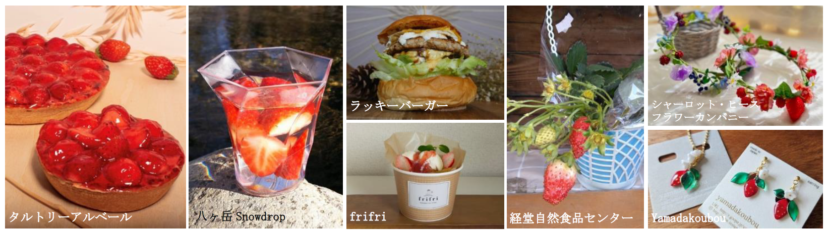 かわいらしい小粒のいちごを敷き詰めてつくる真っ赤な「いちごタルト」(タルトリーアルベール)や、南アルプスのおいしい水で作ったキラキラと輝くゼリーで山梨県産の風味豊かな紅ほっぺを包み込んだ「八ヶ岳Snowdropのいちごゼリー」(八ヶ岳Snowdrop)など、見た目も華やかなスイーツが登場。他では味わえないアイディアメニューとして、チーズに完熟いちごを練りこんだ、やみつきになるてりやきチーズバーガーも登場します。