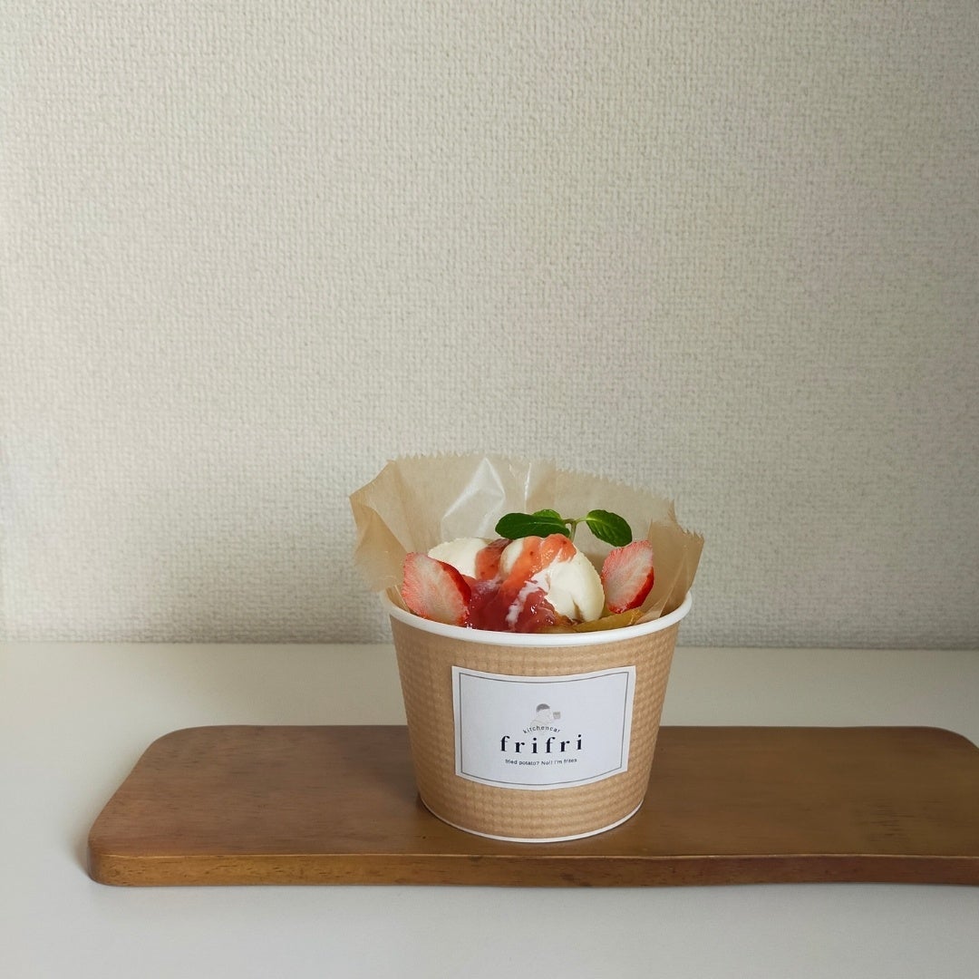 茨城県産紅はるかの蜜芋でつくるおいもフリッツに、バニラアイスといちごジャムを載せたスイーツフリッツ。いちごジャムは、いばらキッスを使用予定。