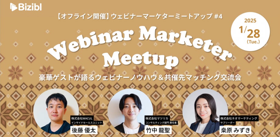 株式会社Bizibl Technologies(本社:東京都千代田区、代表取締役:花谷燿平、以下当社)は、【オフライン交流会】ウェビナーマーケターミートアップ#4 を、2025年1月28日(火)19〜21時に開催します。ウェビナー担当者交流会を設け、共催ウェビナー実施の機会をご提供するほか、豪華ゲストによる特別講演や、Bizibl堅田による講演「共催ウェビナーの成果を最大化する方法」など、学びになるコンテンツもご用意しております。