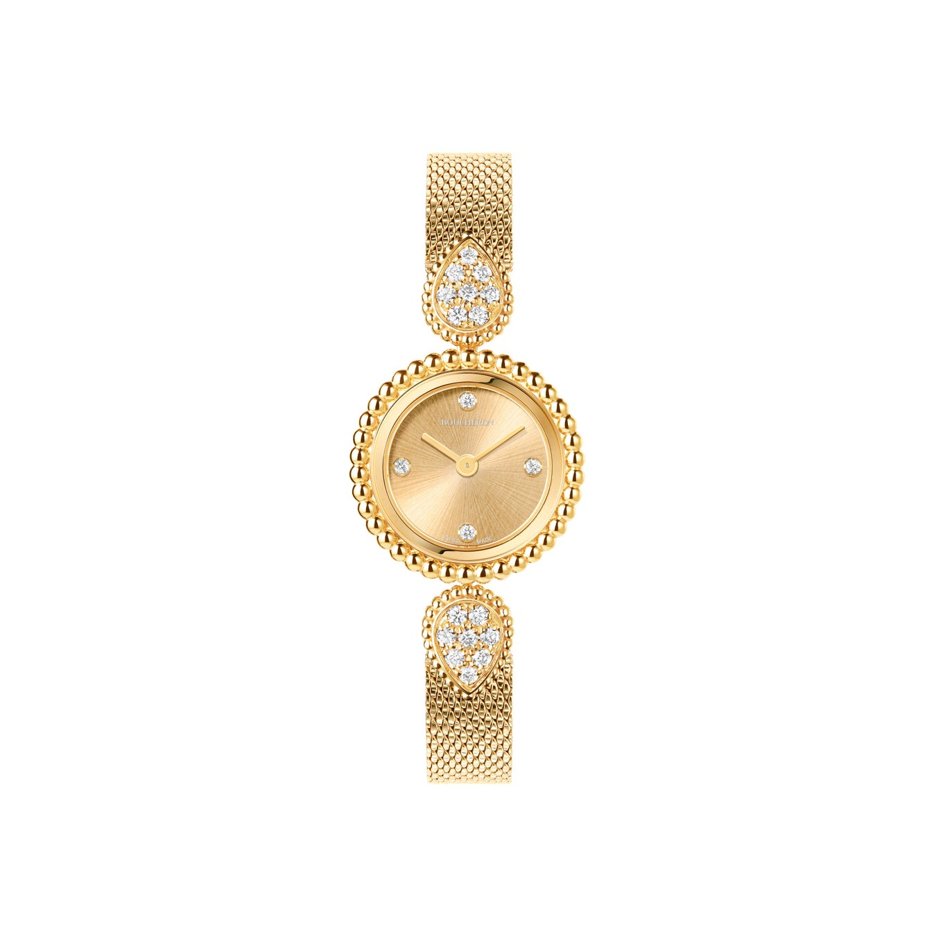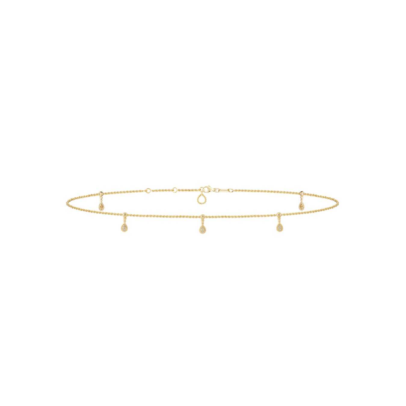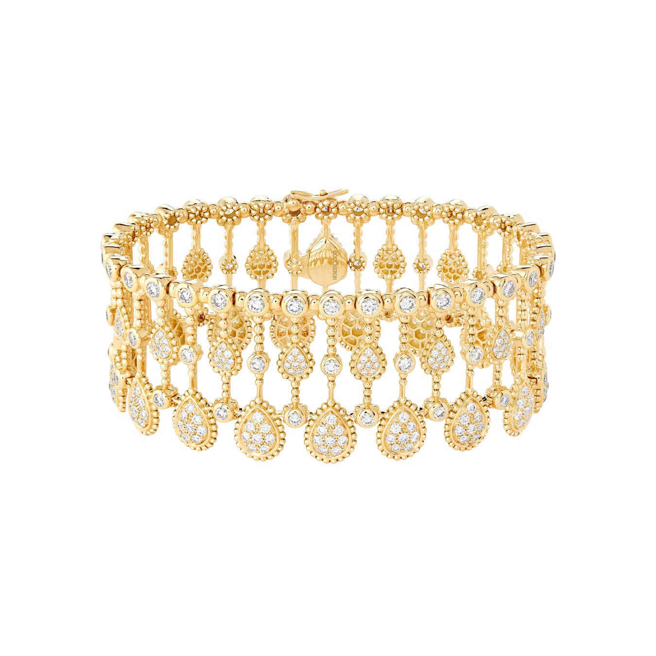マルチモチーフのブレスレットは、セルパンボエムのアイコンであるドロップモチーフをいくつも繰り返し重ね、太陽のようなまばゆい輝きをダイヤモンドのきらめきで表現しています。メゾンとして初のアンクレットは、ドロップモチーフが1つのシンプルなデザインと、マルチモチーフの華やかなデザインの2種類で登場。3段階で長さを調整することもできるので、重ね着けでスタイルをアレンジすることも可能です。