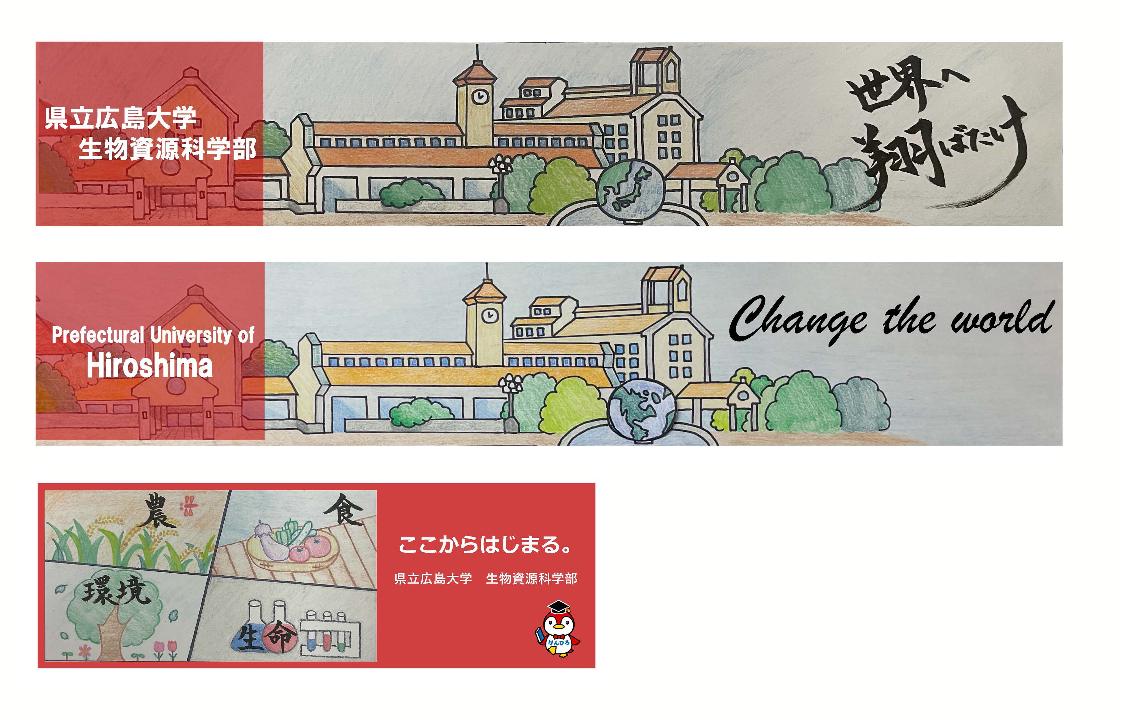 厳選なる審査の結果,総合学術研究科生命システム科学専攻博士課程前期2年生の山本真由さんと生命環境学部4年生の川村愛香さん,矢野華梨さんの2名による共同作品の2点が採用されました。