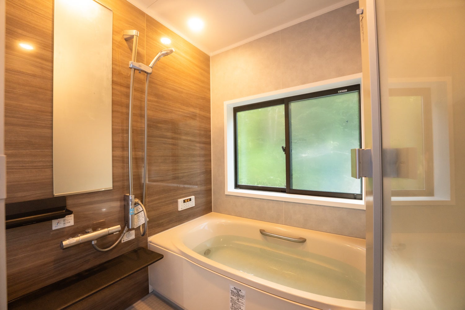 また、各棟のデッキスペースには、個別のお風呂・トイレをご用意しており、滞在中は24時間いつでもご利用ただけます。お風呂の窓からは清流と森を臨み、まるで露天風呂のように秩父の自然を感じることができます。