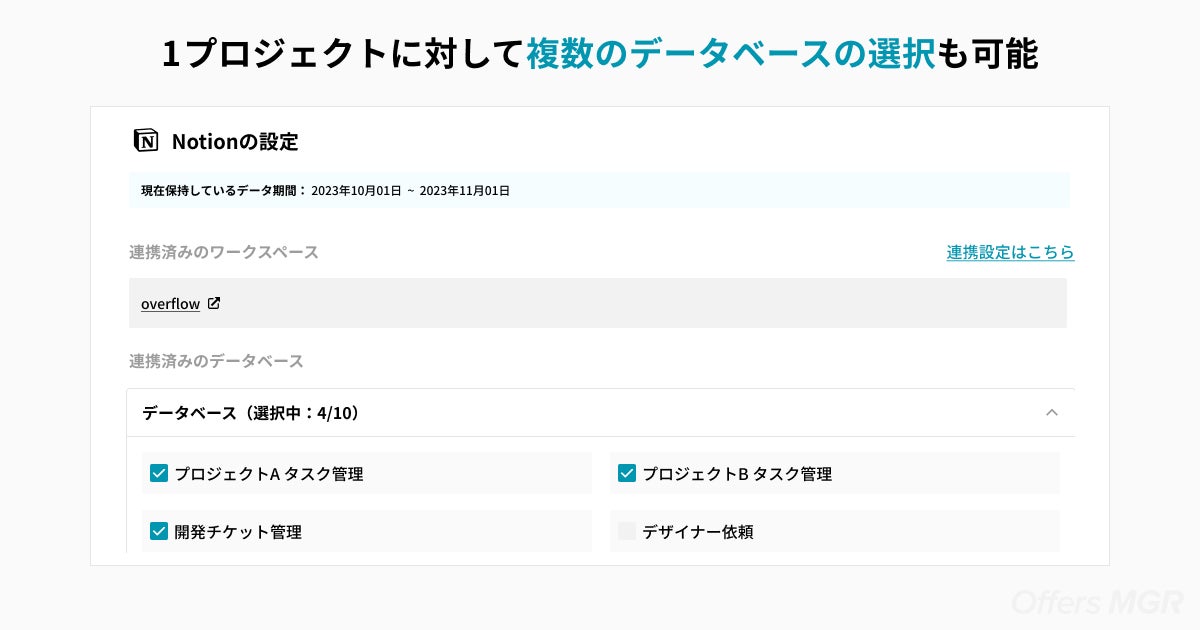 Notionのプロジェクト機能が拡充され、スタートアップやベンチャー企業を中心に、開発のプロジェクト・タスク管理でNotionを使うケースが増えています。従来のOffers MGRによるNotion連携では、ページを作成・編集したアクティビティデータのみの取得しかできず、より詳細なアクティビティデータを可視化したいとのお声をいただいておりました。