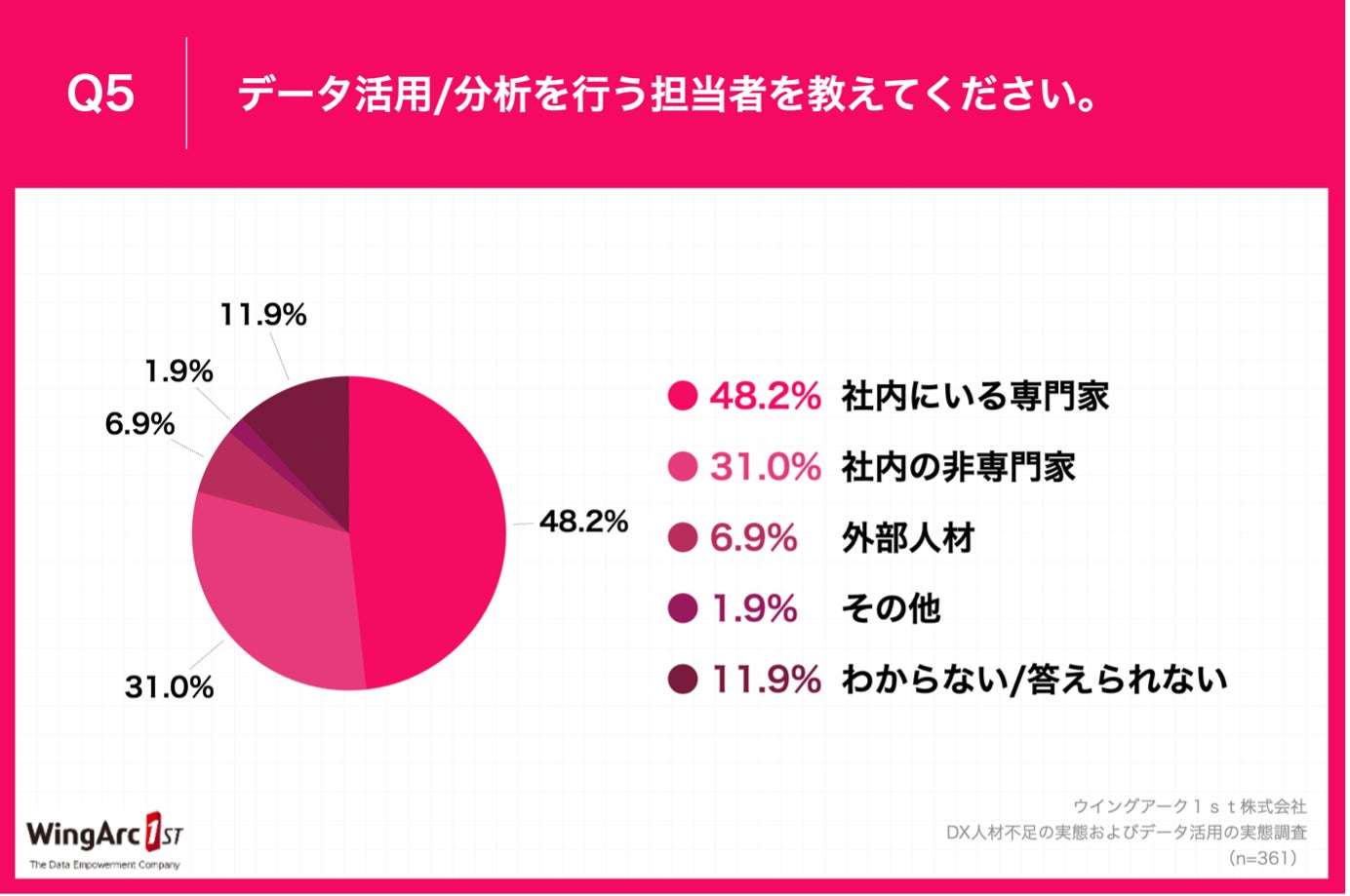 Q2で「全く注力していない」と回答した方以外に、「Q5.データ活用/分析を行う担当者を教えてください。」(n=361)と質問したところ、「社内にいる専門家」が48.2%、「社内の非専門家」が31.0%という回答となりました。