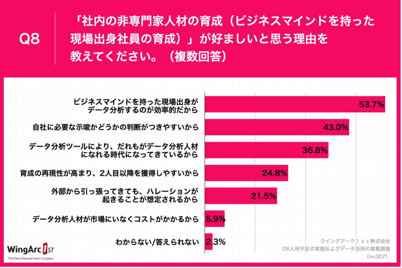 Q7で「b」の選択肢を選んだ方に、「Q8.「社内の非専門家人材の育成(ビジネスマインドを持った現場出身社員の育成)」が好ましいと思う理由を教えてください。(複数回答)」(n=307)と質問したところ、「ビジネスマインドを持った現場出身がデータ分析するのが効率的だから」が53.7%、2022年度より6.1%増加となりました。