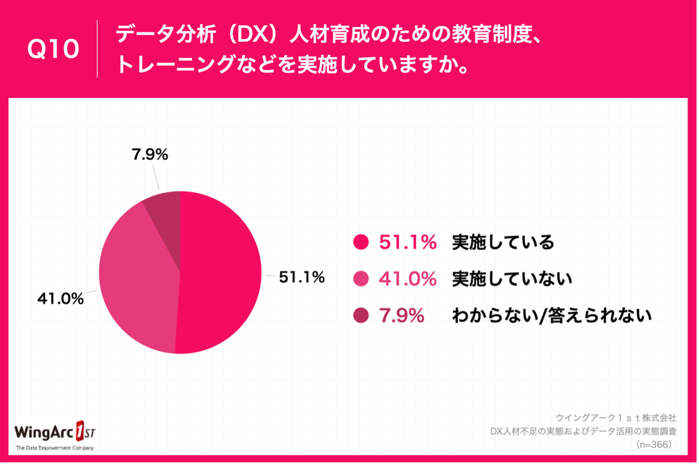 Q1で「まったく行っていない」「わからない/答えられない」「あてはまるものはない」と回答した方以外に、「Q10.データ分析(DX)人材育成のための教育制度、トレーニングなどを実施していますか。」(n=366)と質問したところ、「実施している」が51.1%、「実施していない」が41.0%という回答となりました。