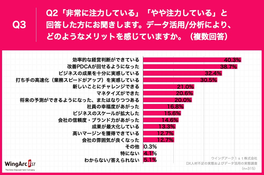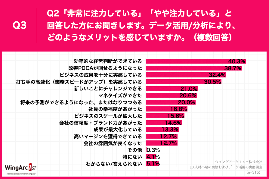 Q2で「非常に注力している」「やや注力している」と回答した方に、「Q3.データ活用/分析により、どのようなメリットを感じていますか。(複数回答)」(n=303)と質問したところ、「効率的な経営判断ができている」が49.5%、「改善PDCAが回せるようになった」が45.5%、「ビジネスの成果を十分に実感している」が39.3%という回答となりました。