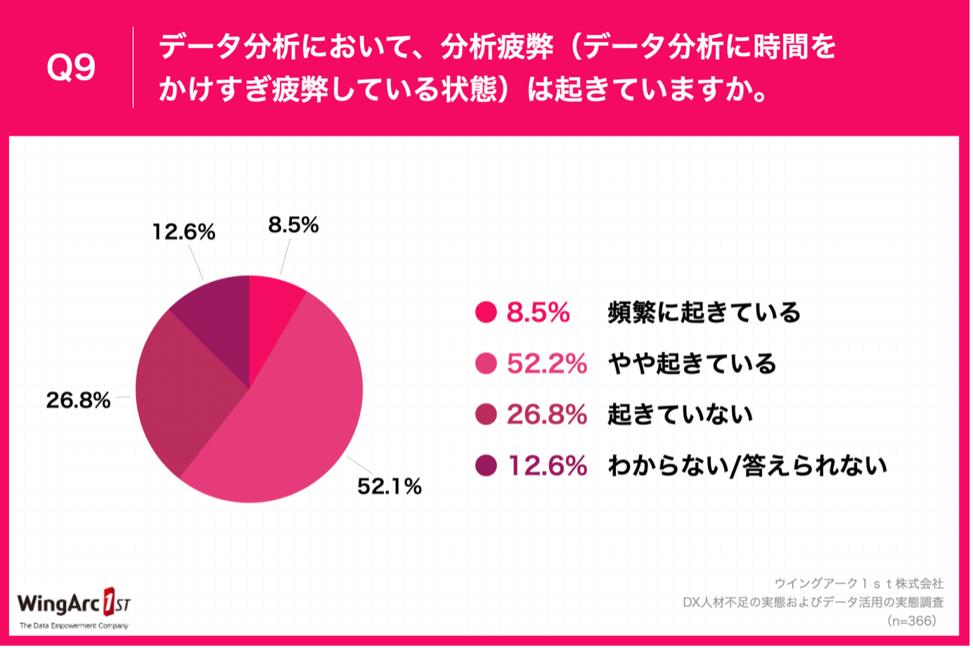 Q1で「まったく行っていない」「わからない/答えられない」「あてはまるものはない」と回答した方以外に、「Q9.データ分析において、分析疲弊(データ分析に時間をかけすぎ疲弊している状態)は起きていますか。」(n=366)と質問したところ、「頻繁に起きている」が8.5%、「やや起きている」が52.2%という回答となり、2022年度調査結果よりも7.8%減少となりました。