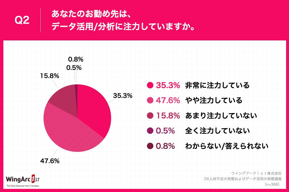 Q1で「まったく行っていない」「あてはまるものはない」「わからない/答えられない」と回答した方以外に、「Q2.あなたのお勤め先は、データ活用/分析に注力していますか。」(n=366)と質問したところ、「非常に注力している」が35.2%、「やや注力している」が47.5%という回答となりました。