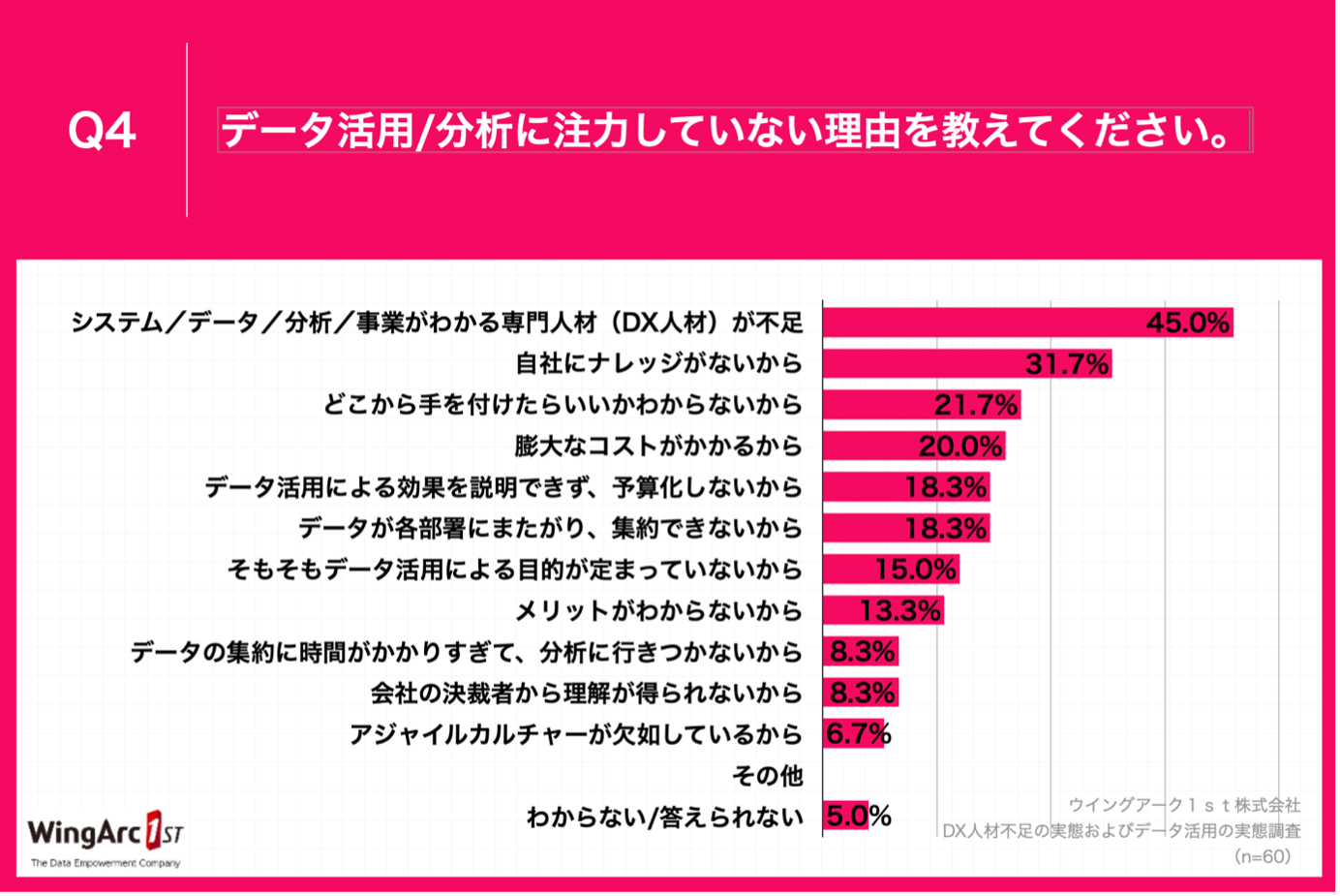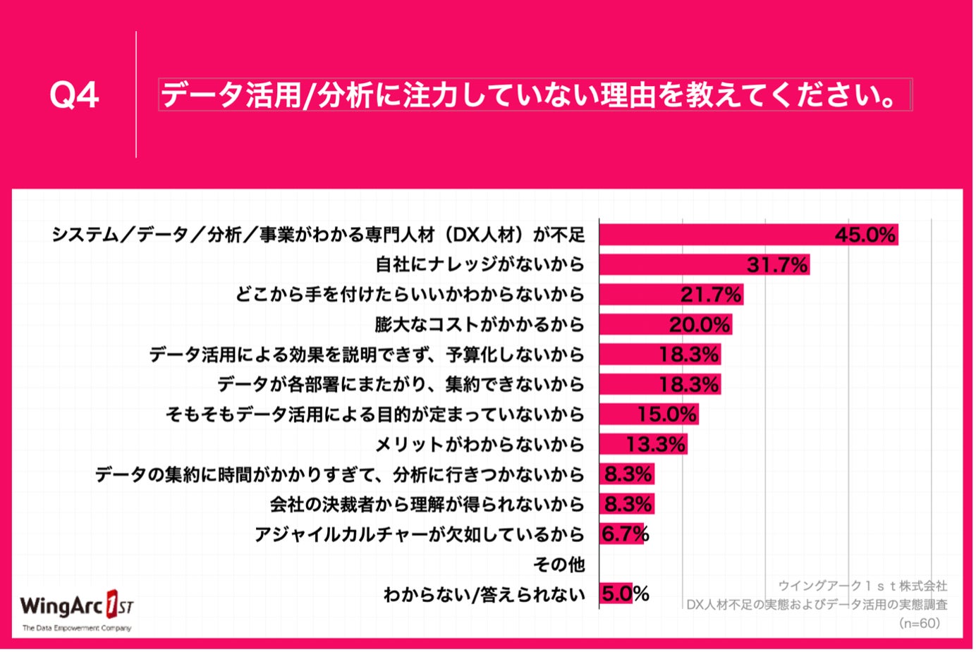 Q2で「あまり注力していない」「全く注力していない」と回答した方に、「Q4.データ活用/分析に注力していない理由を教えてください。(複数回答)」(n=60)と質問したところ、「システム/データ/分析/事業がわかる専門人材(DX人材)が不足」が45.0%、「自社にナレッジがないから」が31.7%、「どこから手を付けたらいいかわからないから」が21.7%という回答となりました。