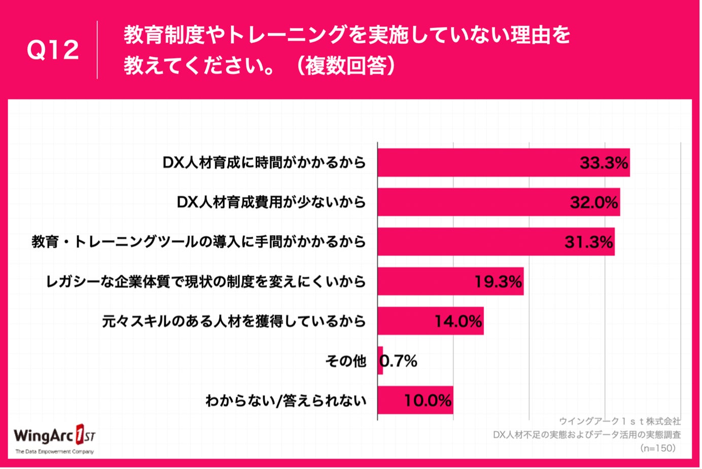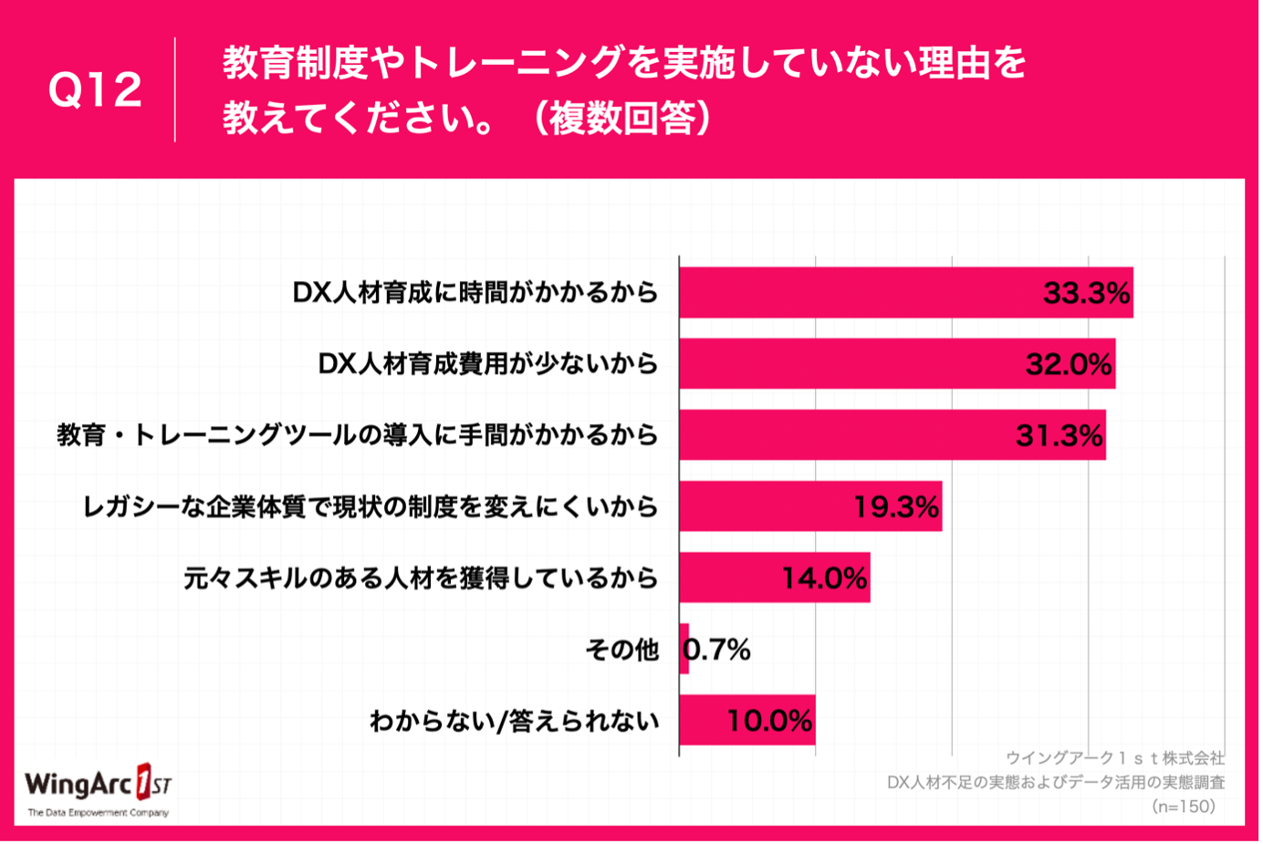 Q10で「実施していない」と回答した方に、「Q23.教育制度やトレーニングを実施していない理由を教えてください。(複数回答)」(n=150)と質問したところ、「DX人材育成に時間がかかるから」が33.3%、「DX人材育成費用が少ないから」が32.0%、「教育・トレーニングツールの導入に手間がかかるから」が31.3%という回答となりました。