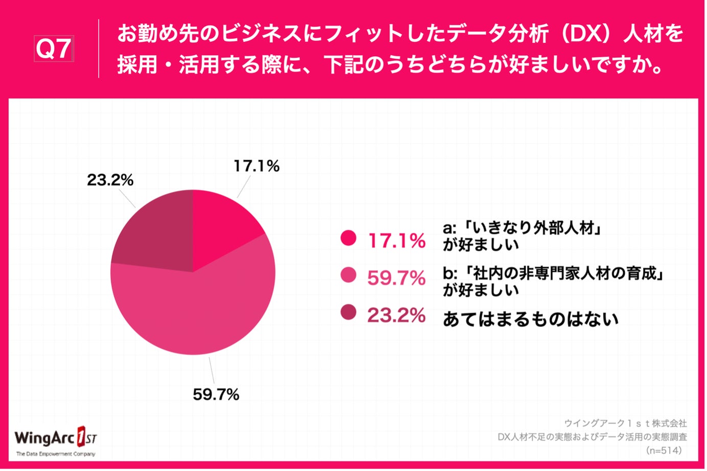 「Q7.お勤め先のビジネスにフィットしたデータ分析(DX)人材を採用・活用する際に、下記のうちどちらが好ましいですか。」(n=514)と質問したところ、「a:「いきなり外部人材(優秀な外部人材を採用・活用)」が好ましい」が17.1%、「b:「社内の非専門家人材の育成(ビジネスマインドを持った現場出身社員の育成)」がいい」が59.7%という回答となりました。