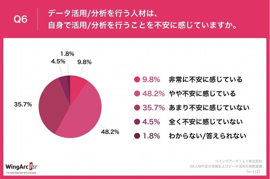 Q5で「社内の非専門家」と回答した方に、「Q6.データ活用/分析を行う人材は、自身で活用/分析を行うことを不安に感じていますか。」(n=112)と質問したところ、「非常に不安に感じている」が9.8%、「やや不安に感じている」が48.2%という回答となりました。