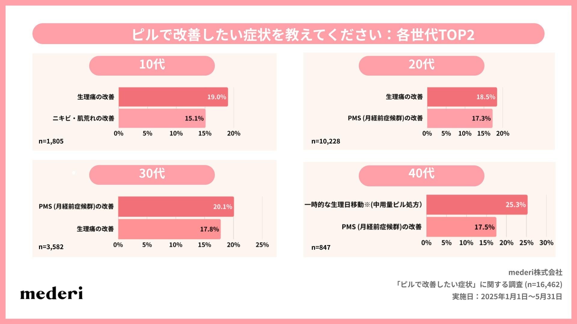 オンラインピル診療サービス『mederi Pill(メデリピル)』を提供するmederi株式会社(本社:東京都目黒区、代表取締役 坂梨 亜里咲 以下、mederi)は、mederi Pillで診療を受けた女性ユーザー16,462名を対象に、「ピルで改善したい症状」に関する意識調査を実施しました。