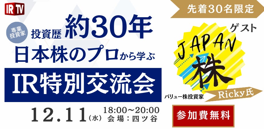 株式会社IR Robotics(所在地:東京都千代田区、代表: 金成柱)は12月11日(水)に「IR特別交流会」を開催します。