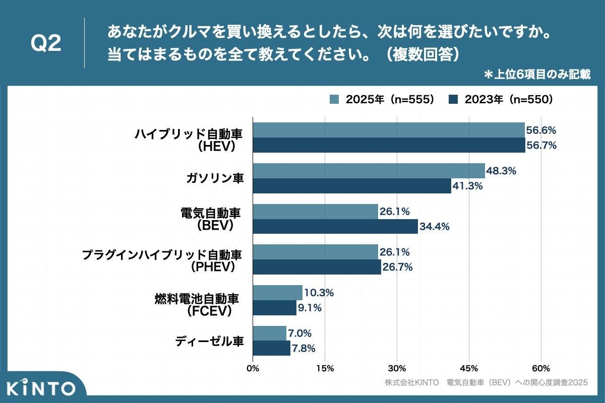 次に買い替えるとしたら、56.6%がハイブリッド車(HEV)、48.3%がガソリン車、26.1%が電気自動車(BEV)を選択。電気自動車(BEV)は23年比8.3ポイント減