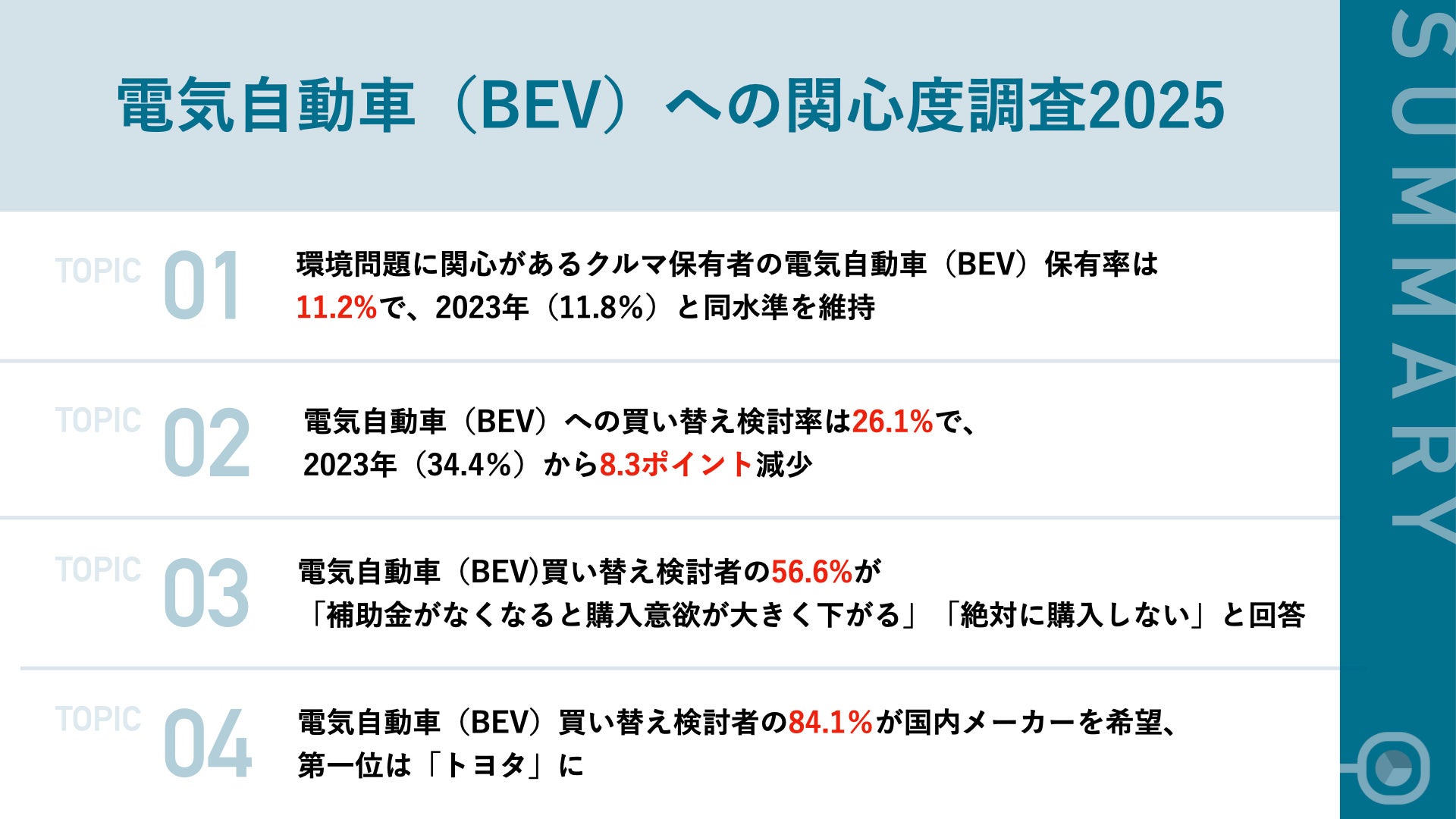 【電気自動車(BEV)関心度調査2025】 環境関心層、BEVへの買い替え検討率は8.3pt減の26.1%に。 補助金の存在が購入意欲に大きく影響