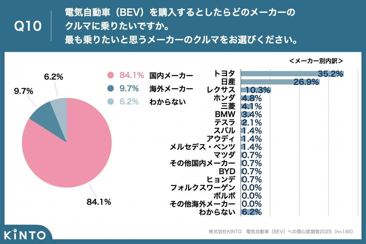 Q2で「電気自動車(BEV)」と回答した方に「Q10.電気自動車(BEV)を購入するとしたらどのメーカーのクルマに乗りたいですか。最も乗りたいと思うメーカーのクルマをお選びください。」(n=145)と質問したところ、「トヨタ」が35.2%、「日産」が 26.9%、「レクサス」が10.3%という回答となりました。また、全体の84.1%が国内メーカーを選択しました。
