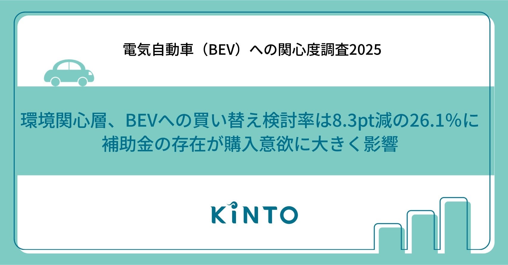 株式会社KINTO(本社:愛知県名古屋市、代表取締役社長:小寺 信也)は、現在クルマを保有しており、かつ環境問題に関心があると回答した方555名を対象に、電気自動車(BEV)への関心度調査2025を実施しましたので、お知らせいたします。