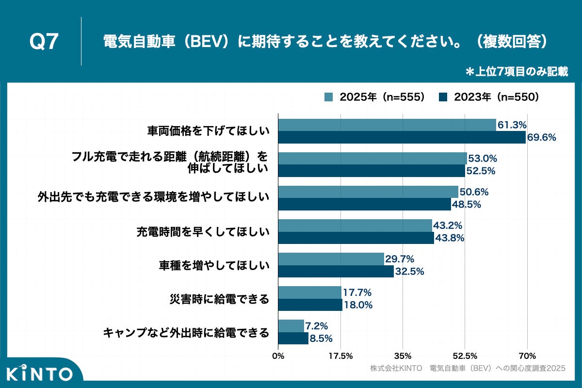 「Q7. 電気自動車(BEV)に期待することを教えてください。(複数回答)」(n=555)と質問したところ、「車両価格を下げてほしい」が61.3%、「フル充電で走れる距離(航続距離)を伸ばしてほしい」が53.0%、「外出先でも充電できる環境を増やしてほしい」が50.6%という回答となりました。