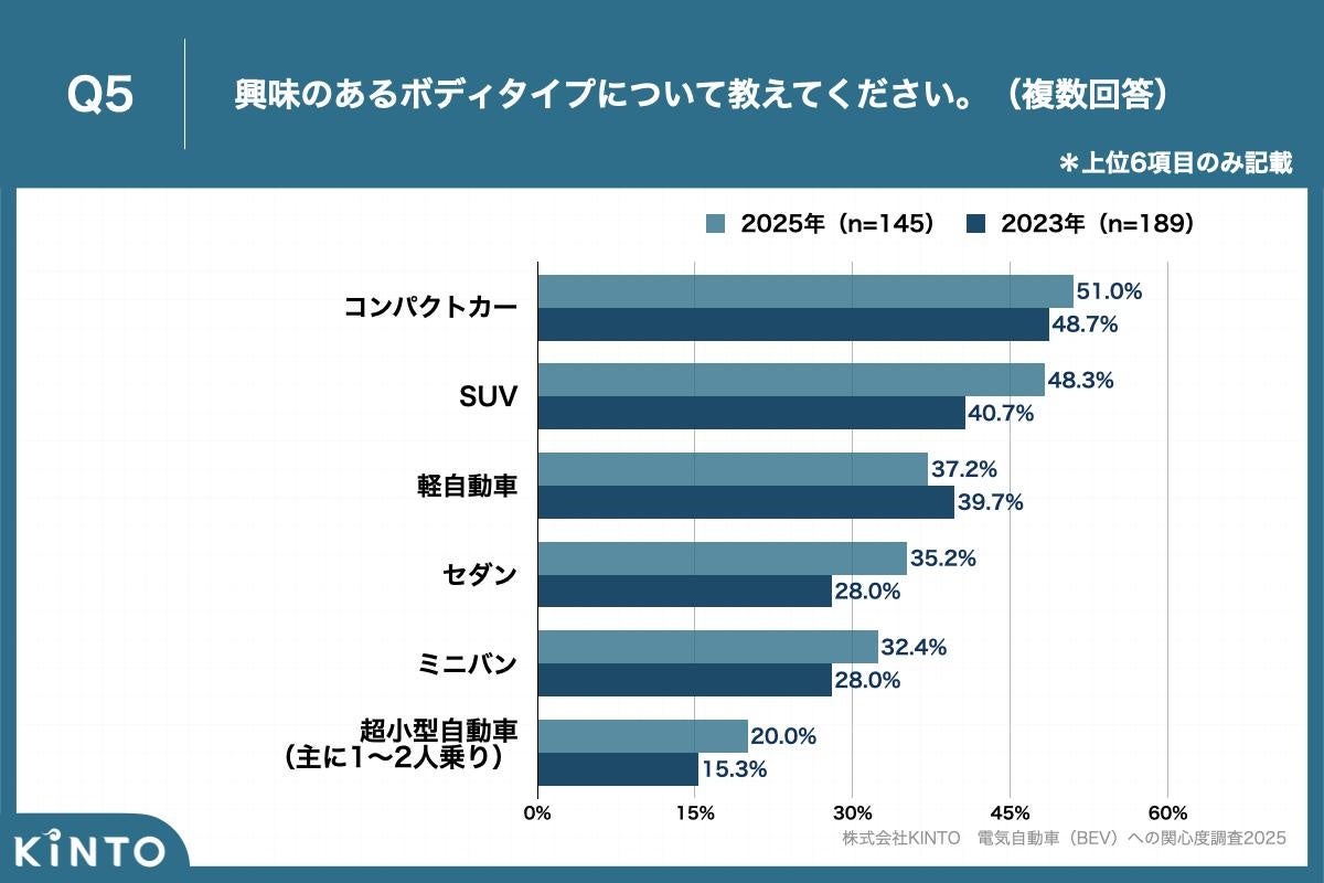 Q2で「電気自動車(BEV)」と回答した方に 「Q5.興味のあるボディタイプについて教えてください。(複数回答)」(n=145)と質問したところ、「コンパクトカー」が51.0%、「SUV」が48.3%、「軽自動車」が37.2%という回答となりました。