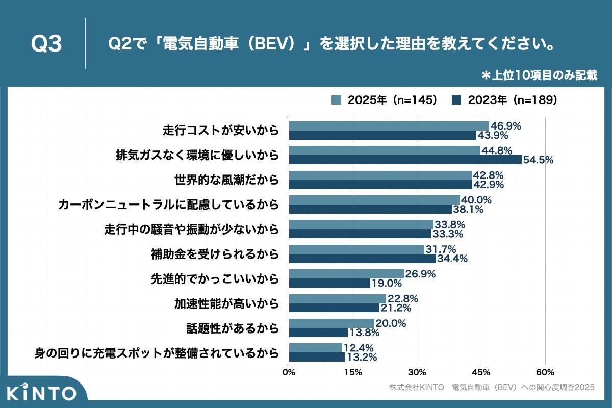 電気自動車(BEV)を選ぶ理由、「走行コストが安いから」(46.9%)が最多、次いで「排気ガスがなく環境に優しいから」(44.8%)、「世界的な風潮だから」(42.8%)