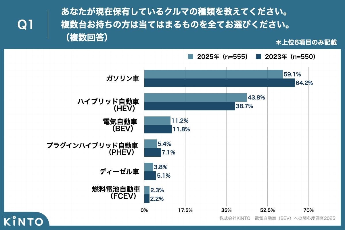 「Q1. あなたが現在保有しているクルマの種類を教えてください。複数台お持ちの方は当てはまるものを全てお選びください。(複数回答)」(n=555)と質問したところ、「ガソリン車」が59.1%、「ハイブリッド自動車(HEV)」が43.8%、「電気自動車(BEV)」が11.2%という回答となりました。
