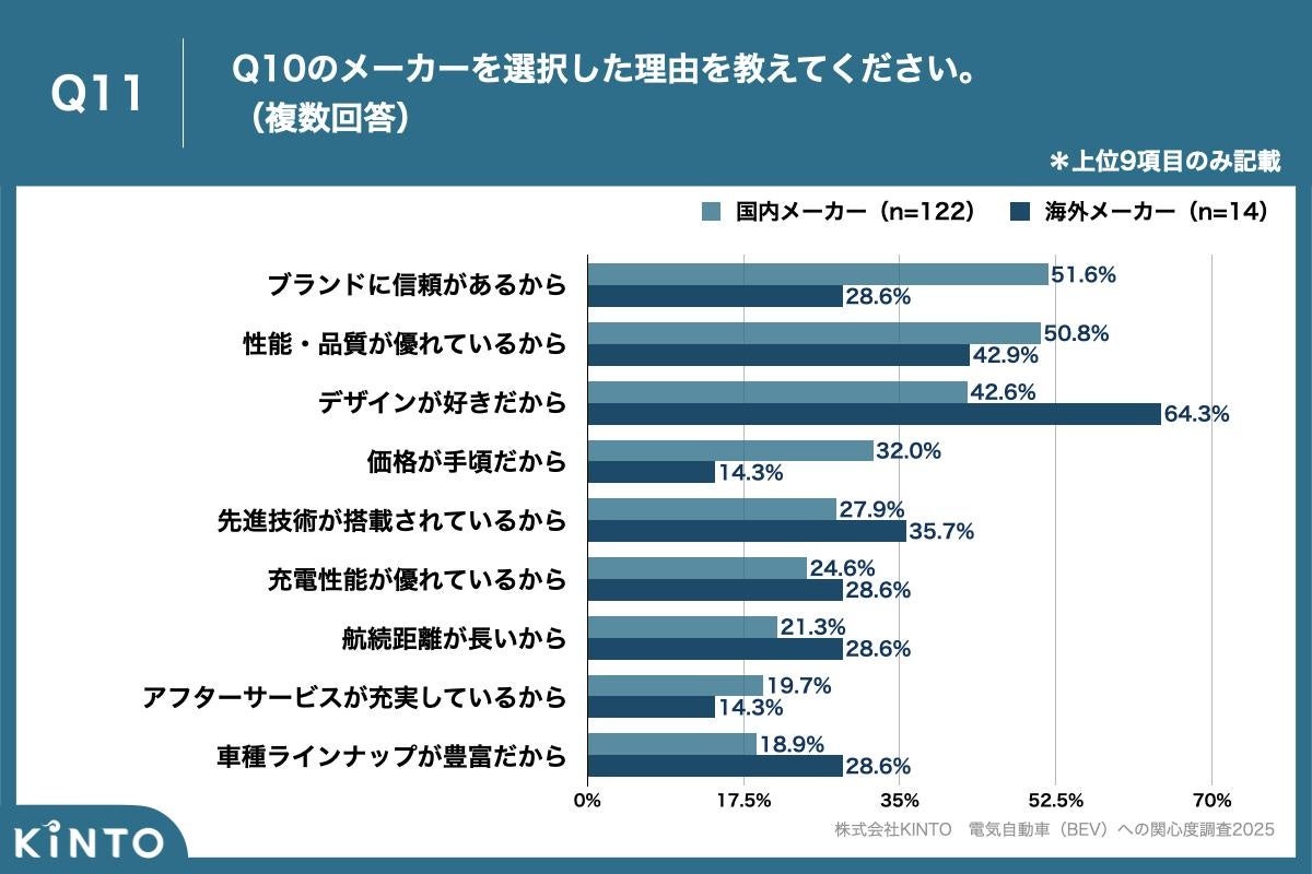 Q10で「わからない」以外を回答した方に「Q11.Q10のメーカーを選択した理由を教えてください。(複数回答)」(n=136)と質問したところ、国内メーカーを選択した方は「ブランドに信頼があるから」が51.6%、国外メーカーを選択した人は「デザインが好き」が64.3%という回答となりました。