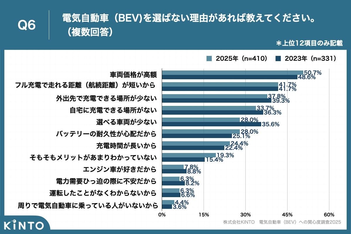 Q2で「電気自動車(BEV)」以外を回答した方に「Q6.電気自動車(BEV)を選ばない理由があれば教えてください。(複数回答)」(n=410)と質問したところ、「車両価格が高額」が50.7%、「フル充電で走れる距離(航続距離)が短いから」が41.7%、「外出先で充電できる場所が少ない」が37.8%という回答となりました。